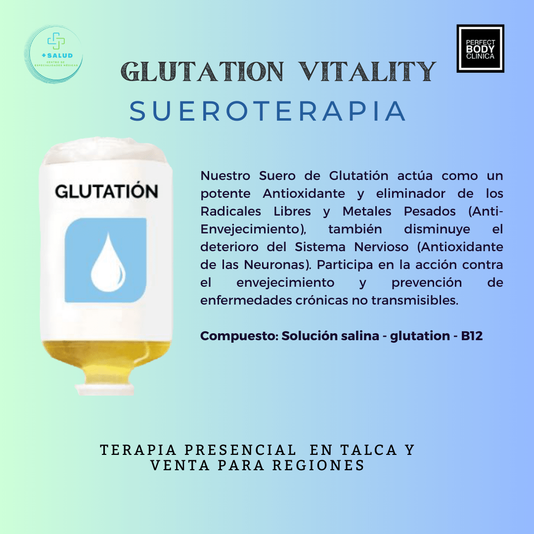Nuestro Suero de Glutatión actúa como un potente Antioxidante y eliminador de los Radicales Libres y Metales Pesados (Anti-Envejecimiento), también disminuye el deterioro del Sistema Nervioso (Antioxidante de las Neuronas). Participa en la acción contra el envejecimiento y prevención d enfermedades crónicas no transmisibles.